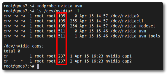 ls /dev/nvidia* -lNote these numbers, you'll need them in the next step