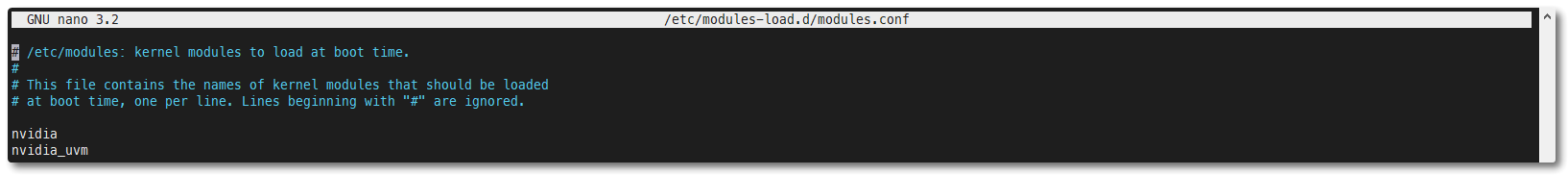 ./NVIDIA-Linux-x86_64-<VERSION>.runEdit /etc/modules-load.d/modules.conf and add the following to the end of the file: