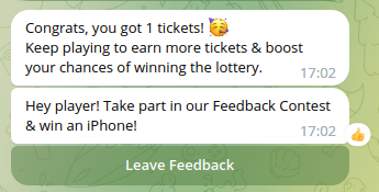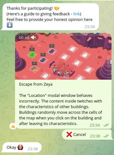 14. I think "here" should be a hyperlink (https://tonplay.io/lottery-contest) 15. A flaw in the TON Play chat bot. I think the word "link" should be a hyperlink. 16. Reminds me of a broken bot from TON Play. He just sends the same (bot from TON Play went crazy) Most likely, the bot programmer got hooked on a set of tickets, but forgot about the user ID. 17. Looks like a broken time parser. According to the rules of the competition every 3 minutes = 1 ticket. But I've been playing Towers: Card Battles for 30 minutes already, and the time parser gave me only 2 tickets. 18. In my opinion, this rule does not work now. The bot does not send messages after the game session. 19. It looks like the bot is not behaving correctly with video content. 0. Pressed the send feedback button 1. Attached a video 2. Wrote a text for it 3. Sent a message to the bot 4. The bot did not react in any way and continued to offer to press the "cancel" button.