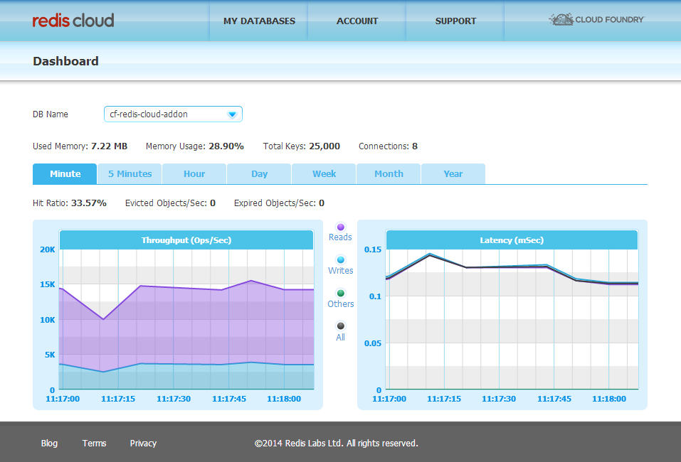 Our dashboard presents all performance and usage metrics of your Redis Cloud service on a single screen, as shown below: