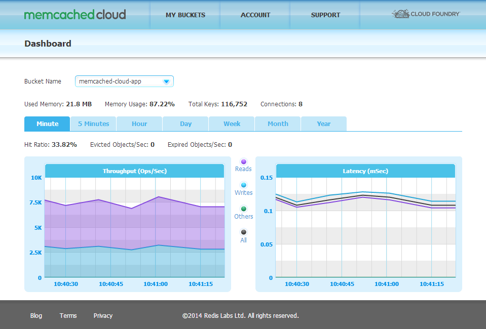 Our dashboard presents all performance and usage metrics of your Memcached Cloud service on a single screen, as shown below: