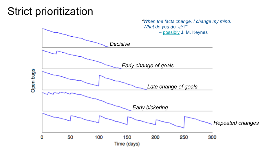 This is a huge one that we'll get to next - and so is flexible prioritization. Since everyone always knows what your priorities are [...], then people are more likely to work on tasks in the "right" order, which gets features done sooner than you can change your mind. Which means when you do change your mind, it'll be less expensive. That's one of the main effects of Agile. Basically, if you can manage to get everyone to prioritize effectively, you don't need Agile at all. It just turns out to be really hard.