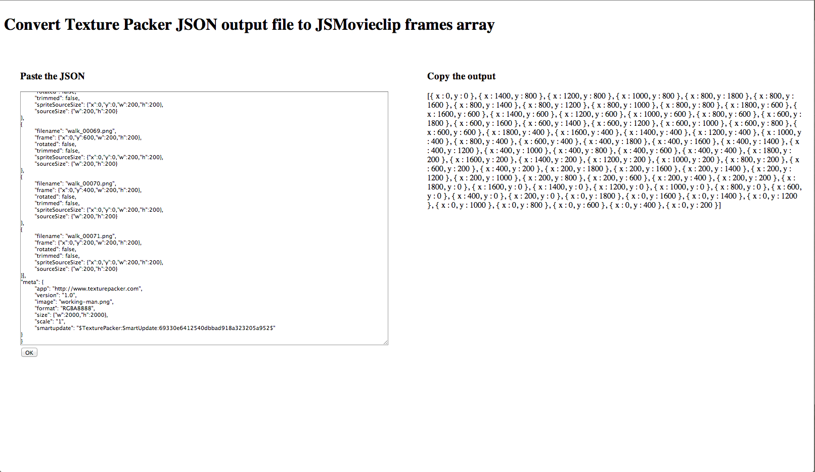 Now, we need to convert the JSON to a simpler Javascript Array, with just the essential for JSMovieclip. In order to do that, you can use this little convertor