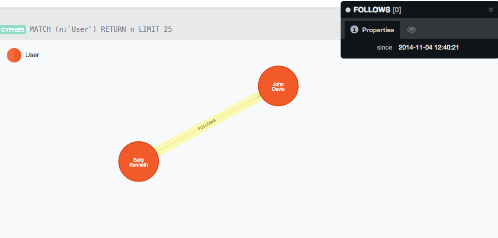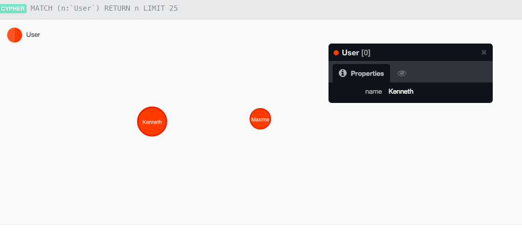 $client->sendCypherQuery($query);If you look at the graph now, you'll see the two User nodes, but they feel quite alone :( , no ?