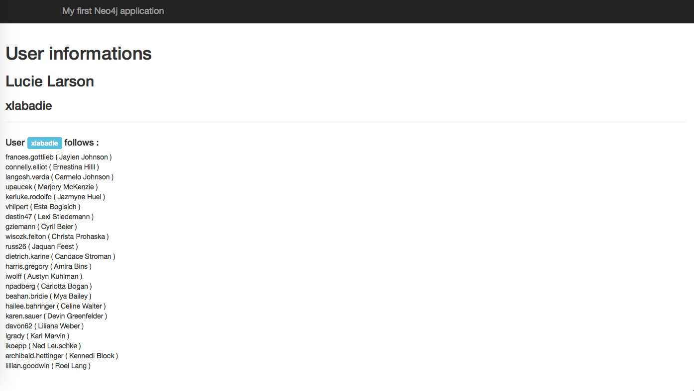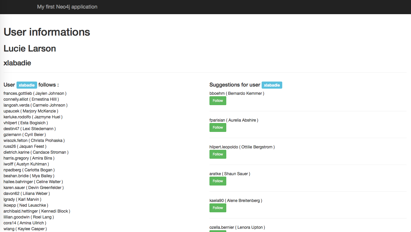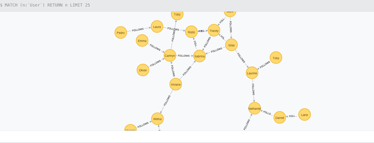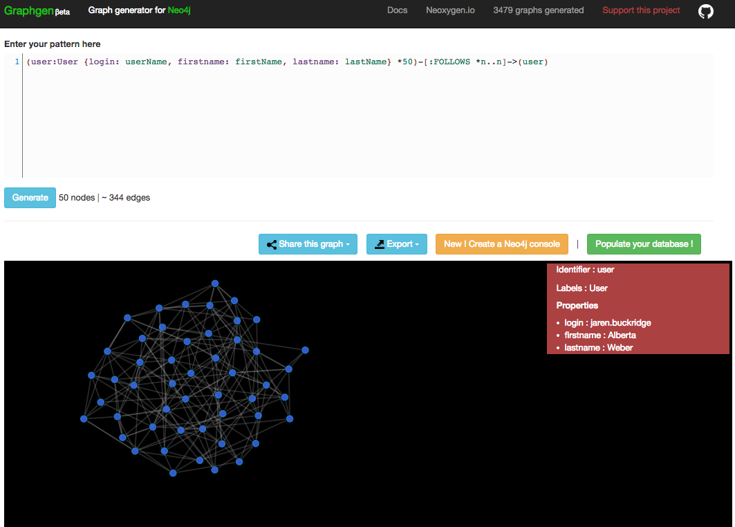 (user:User {login: userName, firstname: firstName, lastname: lastName} *50)-[:FOLLOWS *n..n]->(user)You can see that it automatically generates a graph with 50 users, the relationships, and realistic values for login, firstname and lastname. Impressive, or?