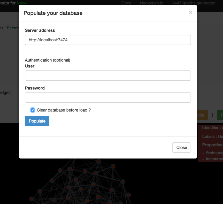 Let's import this graph in our local graph database, click on Populate your database and use the default settings.