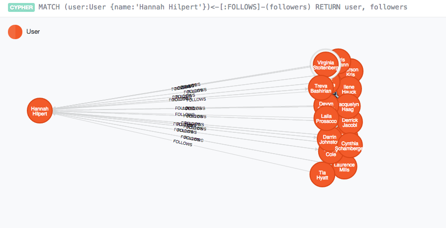 Looking at our last graph of users, a query that will retrieve Hannah Hilpert and the users following her will be written like the following :