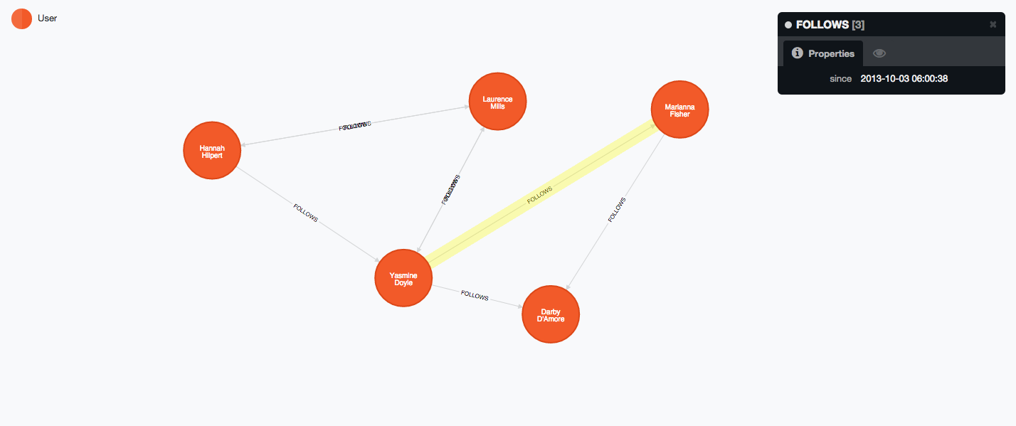 The link between these two users will be represented as a Relationship, which can also have properties and a Type to identify the nature of the relationship. Relationships add semantic meaning to your data.