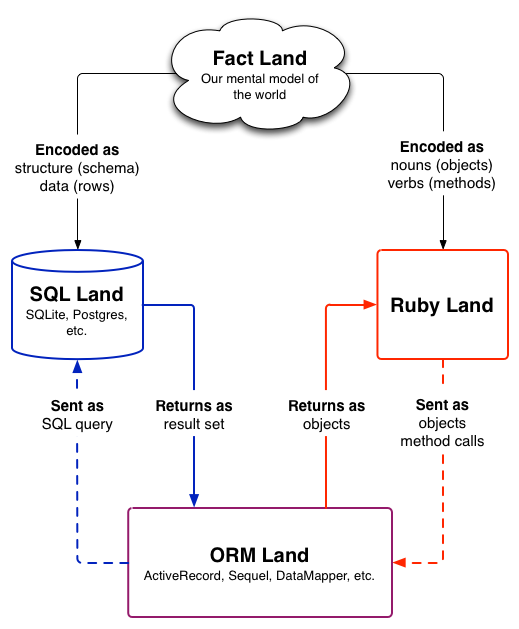 Here's a high-level view of how Fact Land, SQL Land, and Ruby Land relate to each other. Most of the time Ruby Land interacts with Fact Land by going through SQL Land. Because SQL is so different from most general-purpose programming languages, we build technologies called Object-relational mappers to make it easier for us to interact with the database in SQL Land.