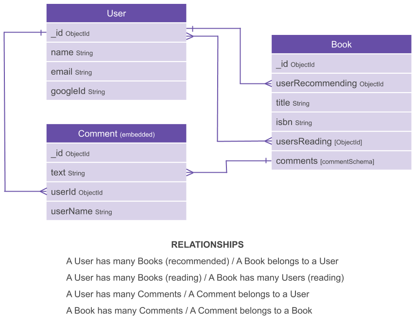 Note that in this app, a user "recommends" a book to other users by creating it in the database. This one-to-many relationship is modeled with a userRecommending property on the Book model that references the _id of the user that created each particular book.