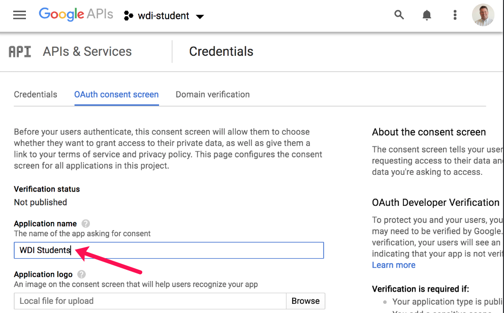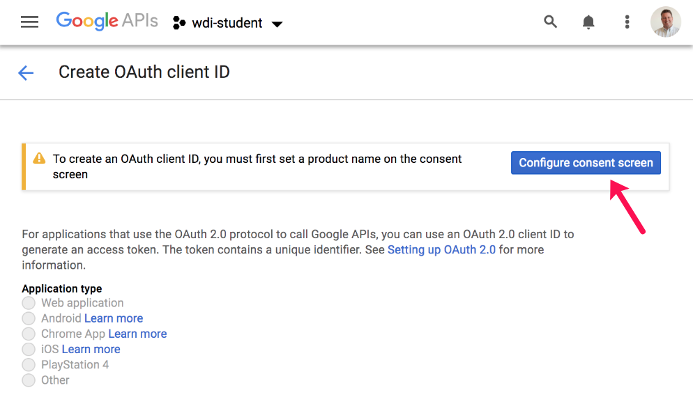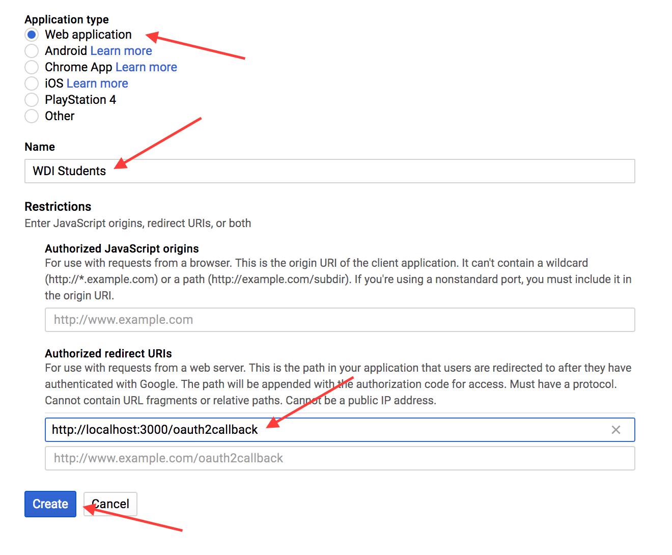 Important: We will only want access to the most basic of resources the user could grant us - their name and email. This is all our app typically cares about, unless it is designed to work with a user's Facebook friends, tweets, Dropbox data, etc.