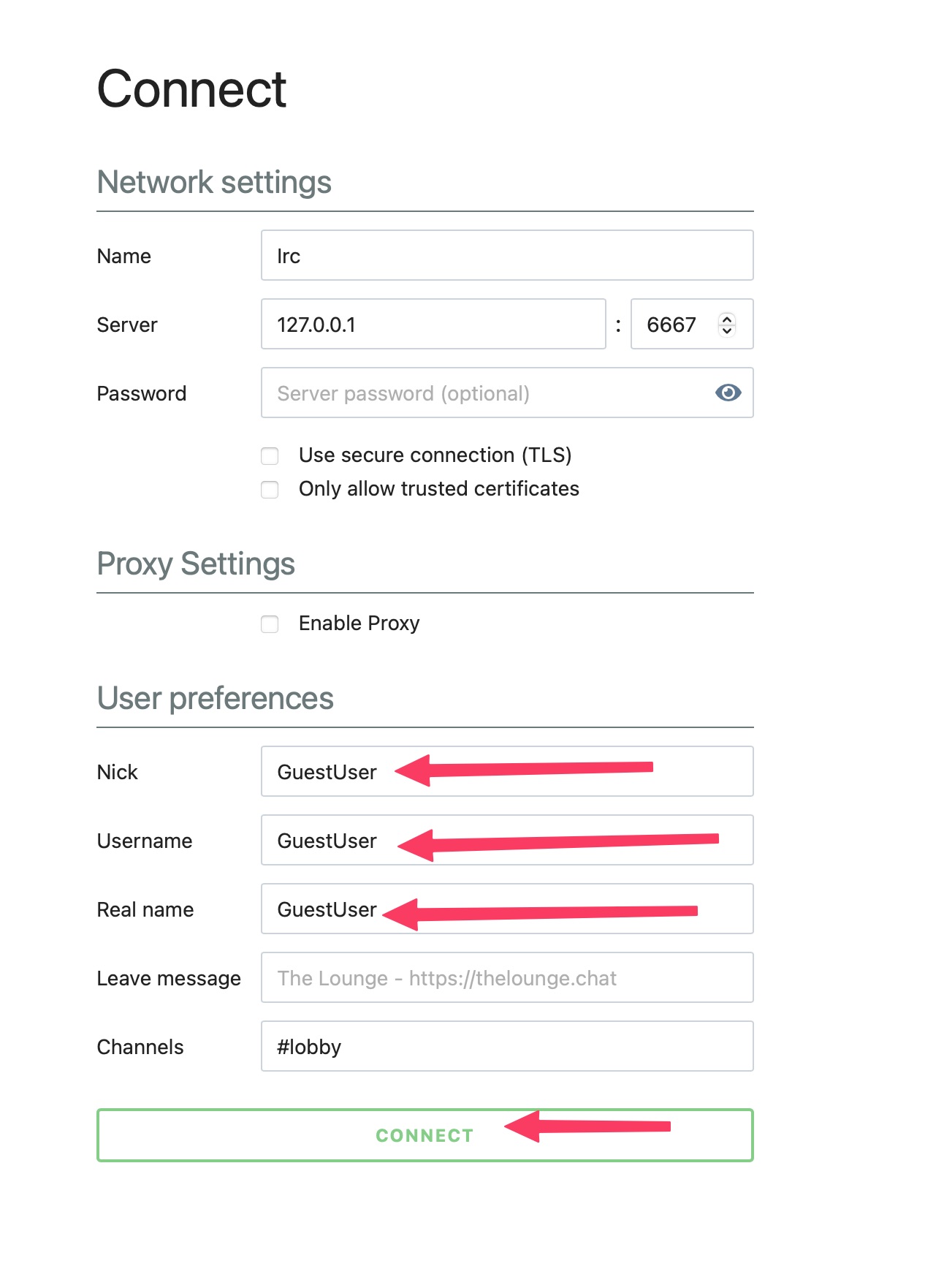 - You should see something like and the "User preferences" section, put your name (or fun name, please be family friendly) and click the "CONNECT" button.