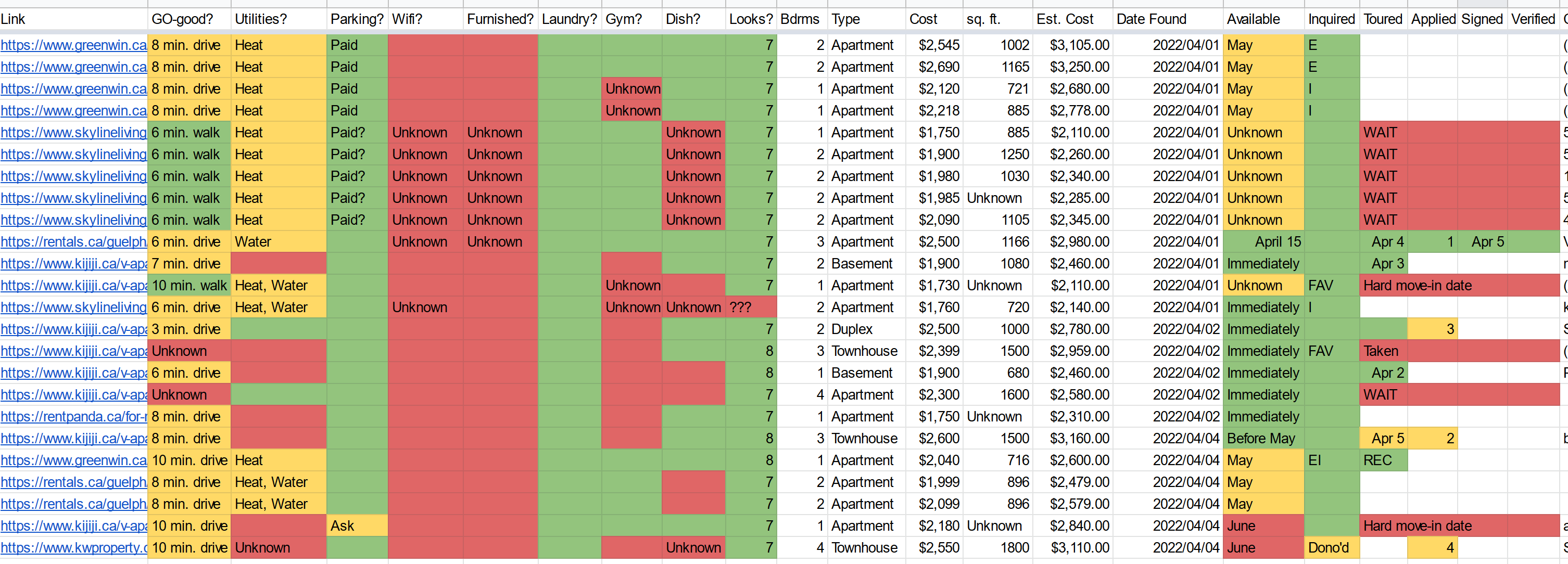 Why should you do this? When you're looking at apartments, you might feel a slurry of emotions. You might feel hopeless, like you are going to be homeless, broke (paying for rent), or will find a shitty house. Your mind is not a consistent place to hold these thoughts - some days you will want to sign the first apartment willing to accept you; other days you only want AAA+ apartments. It is not optimal to keep these thoughts in your head.