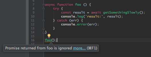 //noinspection JSIgnoredPromiseFromCallin WebStorm (This is actually my favourite!)o3. Use one of the fugly solutions above.