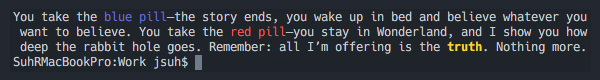 | alias whichpill='echo -e "You take the ${BLUE}blue pill${NOCOLOR}—the story ends, you wake up in bed and believe whatever you want to believe. You take the ${RED}red pill${NOCOLOR}—you stay in Wonderland, and I show you how deep the rabbit hole goes. Remember: all I’m offering is the ${YELLOW}truth${NOCOLOR}. Nothing more."'; |