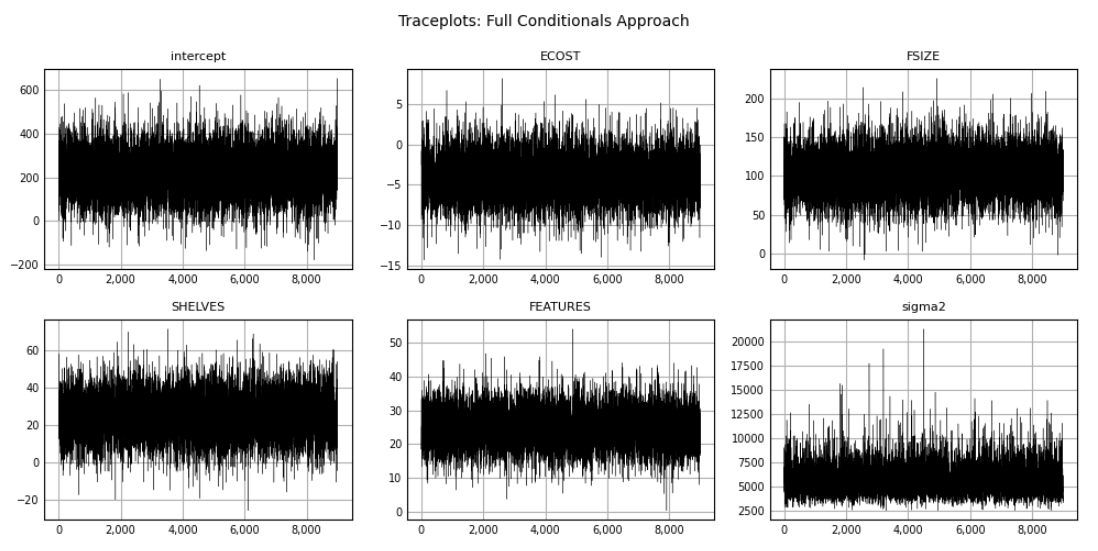 sigma2 = sigma2[burnin:]Traceplots can be produced to visualize the variability of samples across iterations: