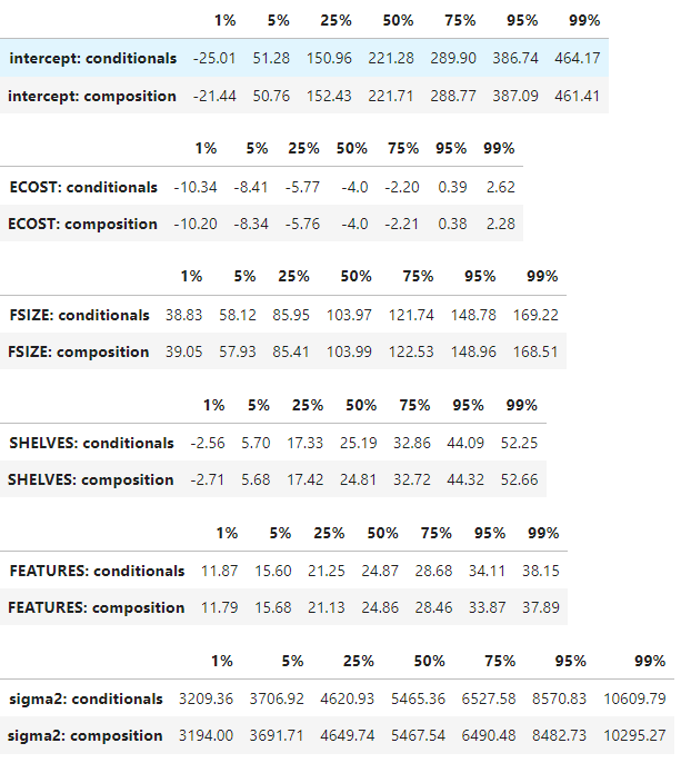 We can compare posterior percentiles from the full conditionals and composition method to demonstrate equivalence: