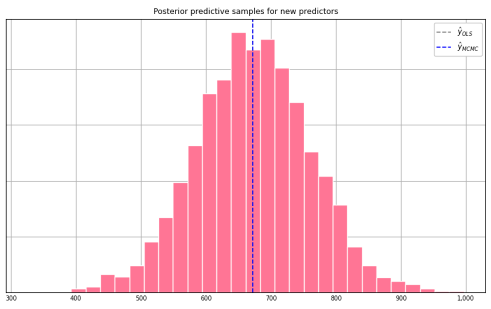 label0, label1 = r"$\hat{y}_{OLS}$", r"$\hat y_{MCMC}$"