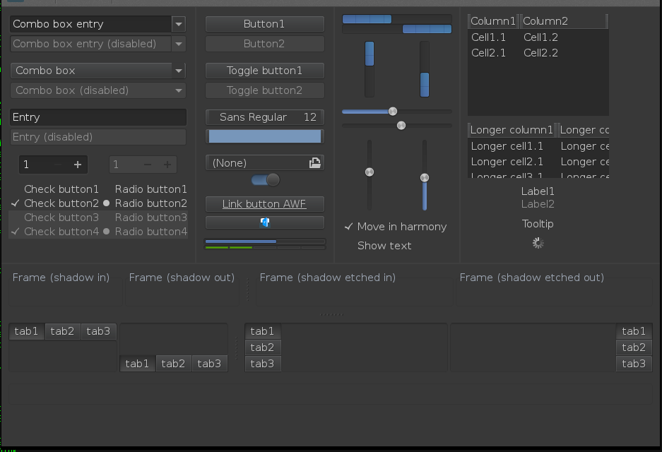 lib.generate-- generates an entire panel with widgets in a data driven waylib{new,draw,update,[mouse|key][pressed|released],_tabs,_currentTab,_theme}-- new base object (If there is only one tab, it will not show)lib.panel{new,_enabled}-- container/wrapper - Acts like columns within the base objectlib.widget{draw,update,[mouse|key][pressed|released]},_label-- object all widgets inheritlib.widget.stepper{new,_enums,_currentEnum}-- enumlib.widget.text{new,_value}-- string (disabled makes a label)lib.widget.checkbox{new,_value}-- booleanlib.widget.slider{new,_value}-- range 0..1lib.widget.button{new}-- function (abstract conceptual idea)