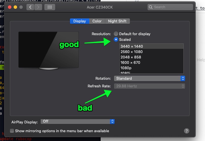 - An HDMI cable connecting the dock to an Acer CZ340CK. Importantly, it purports to be able to do two important things: Run at a 75Hz refresh rate, and display with a 3440x1440 resolution.