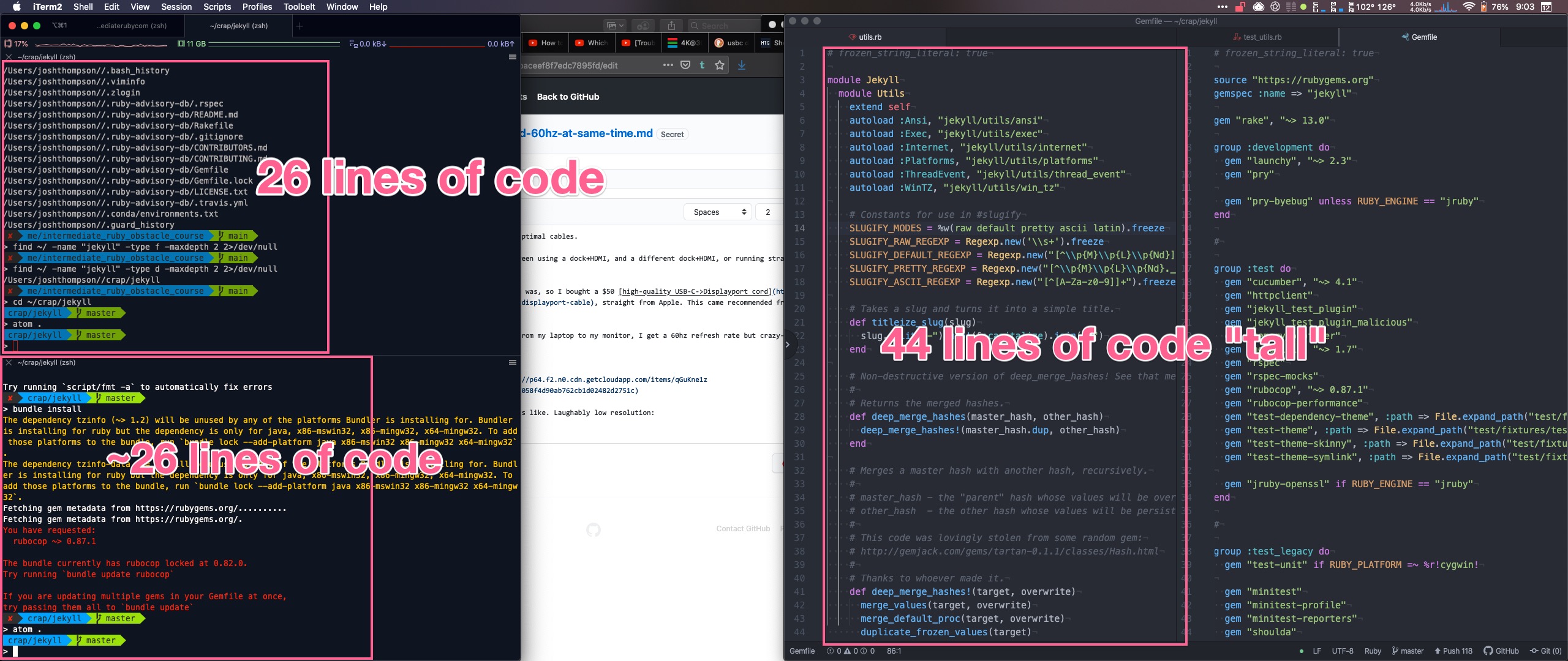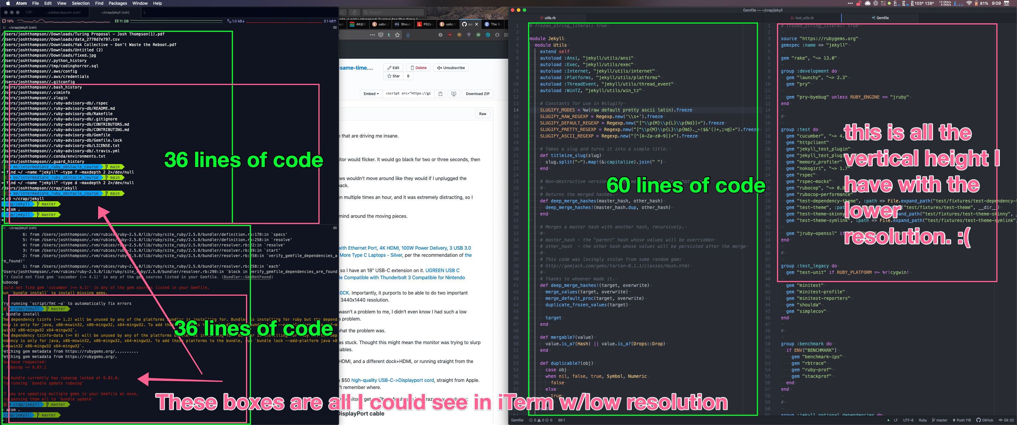 And here's what my editor/terminal looks like. Laughably low resolution. I've labeled the line counts in various spots, so you can compare to how much screen real-estate this costs me: