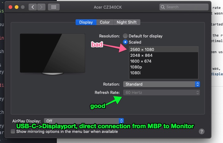 usbc to display port 2560x1080, cannot get to 4kusbc display port not giving full resolutionmacbook pro external display refresh rate stuck 29 hzmacbook pro option click scaled to change external display resolution not working