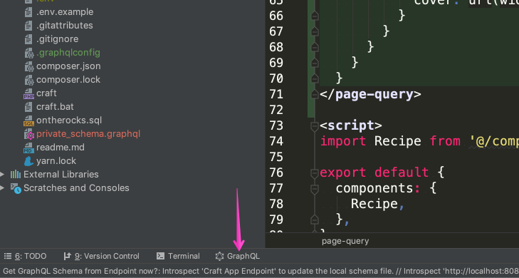 - Now close and reload your project - you should see a bubble in the bottom right of the IDE (see below) asking you if you want to "Get GraphQL Schema from Endpoint now?" (you can also see this in the PhpStorm console) - click the link that says "Introspect 'http://localhost:8080/_graphql'" and boom, it should work!
