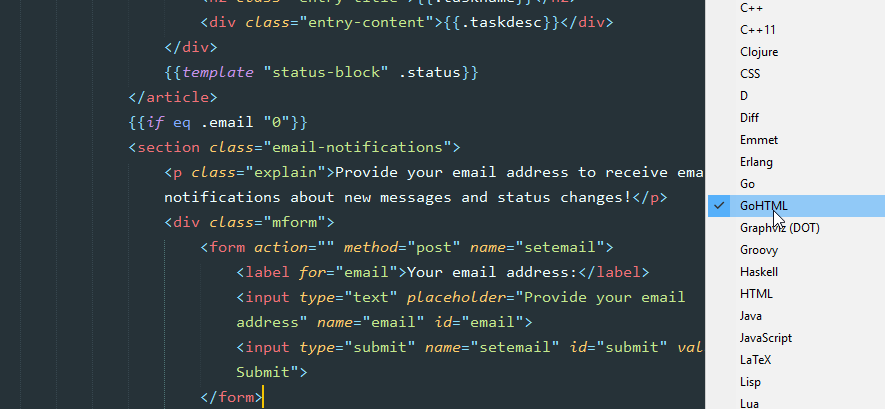 Hello friends. It is always very annoying to write HTML templates for a Go application in Sublime Text, and only have the HTML part of the code highlighted. Those white lines of code -- which are the most important parts of the template files -- are just not pleasant to the eye.