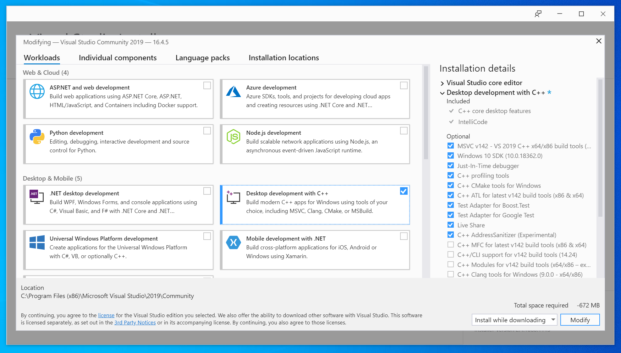 - install Visual Studio Community 2022 with the "Desktop development with C++ item", ensuring "Windows 10.0.18362.0 SDK" is selected