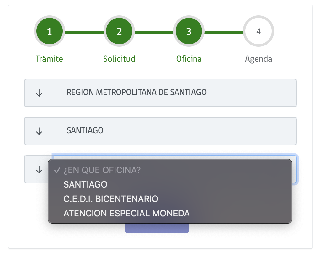 - Cuando te entregue el calendario con opciones disponibles y probablemente no te muestre opciones dentro de este año, reload... reload hasta que se abra un cupo con fecha más cercana (por eso en Santiago Centro que es la que más tiene cancelaciones de agendamiento).