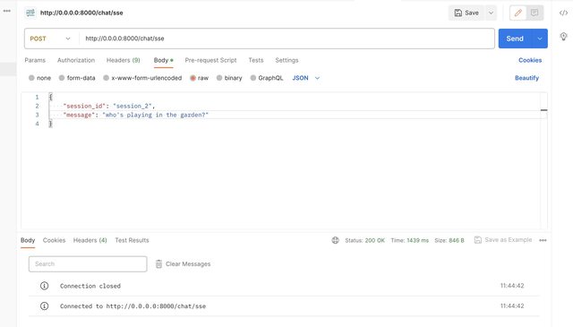yield ChatSSEResponse(type="error", value=str(e)).json()If you get TypeError: unsupported operand type(s) for |: 'type' and 'types.GenericAlias' in line value: str | list[Document], you should replace it with value: Union[str, list[Document]].