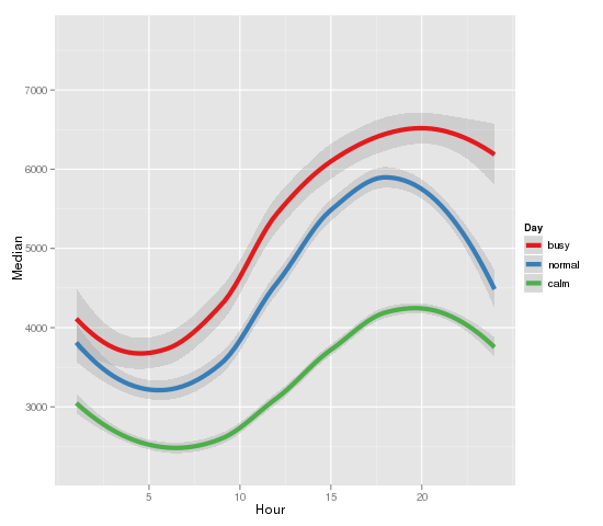 First graph below shows how GitHub users actions are spread over time during the day. The X axis on the graph is labeled with the hours of the day (GMT) and the Y axis represent median values of the actions for each hour. From it, we can make a deduction, that highest load for GitHub can be expected between 15:00 and 17:00 GMT and lowest to be expected between 05:00 and 07:00 GMT. The color of the line indicates how busy was the day based on quantiles: green are calm days (20% of days), blue – normal days (50% quantile) and red are busy days (80% quantile). I should to mention, that auto-correlation or serial correlation is high (70% for following hour), which means, that busy hours tend to be followed by busy hours and calm hours tend to be followed by calm hours. Moreover, busy days tend happen after busy days.