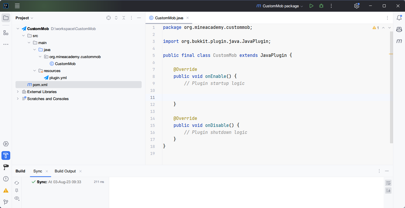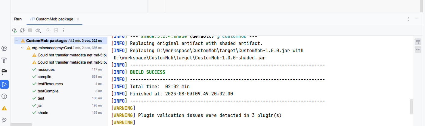 getLogger().info("Hello MineAcademy.org!");Then I run the package goal to compile the plugin.
