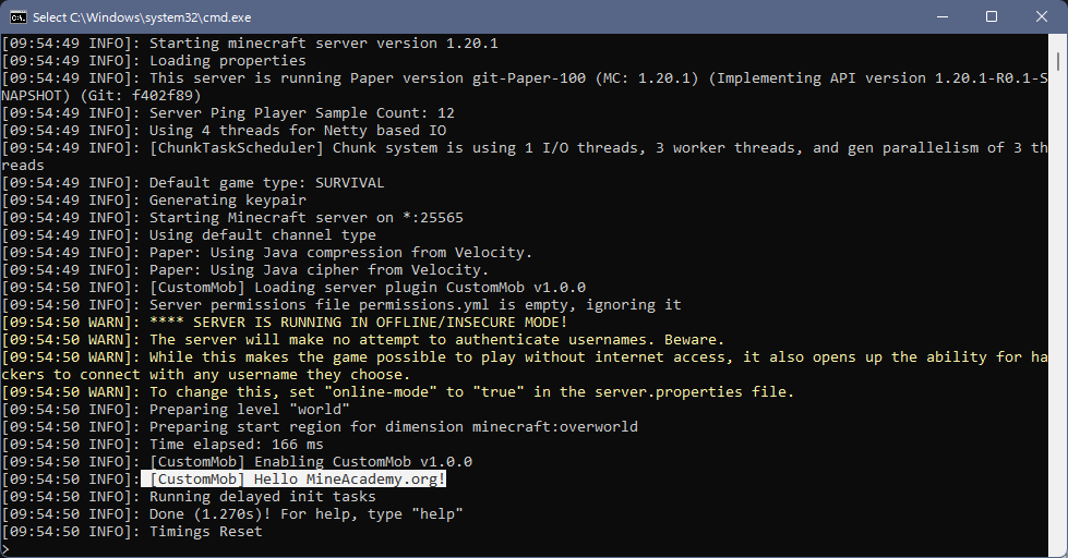 Finally, drag your plugin .jar from target/ into plugins/ folder, start again and voila, you have your first Minecraft plugin!