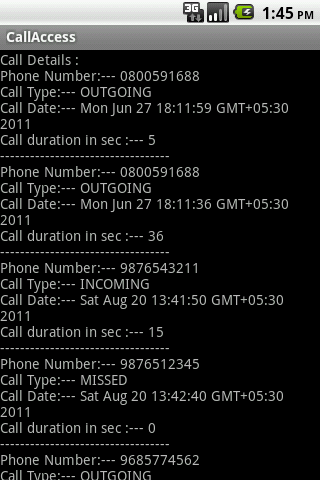 }Using this application user can access his call history. It shows call number, call type i.e. incoming/outgoing/missed call, call date-time and call duration. Here is the output where user can see all details: