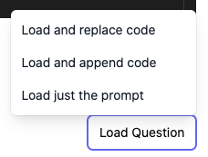 Load just the promptwill only update the prompt panel without affecting any of the existing codeLoad and replace codewill load the prompt and also replace any existing code with the selected code snippetLoad and append codewill load the prompt and append the snippet at the bottom of the existing content