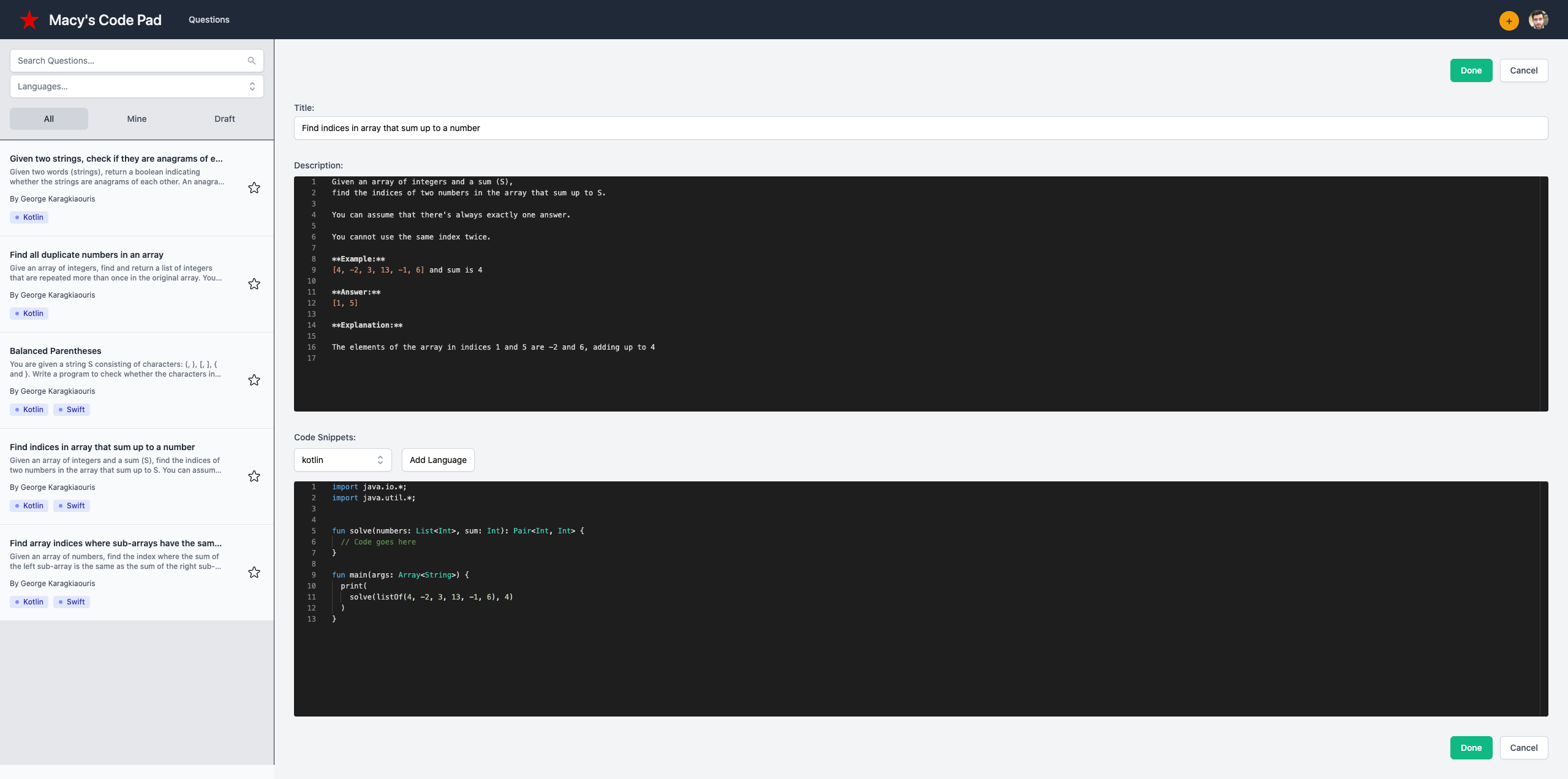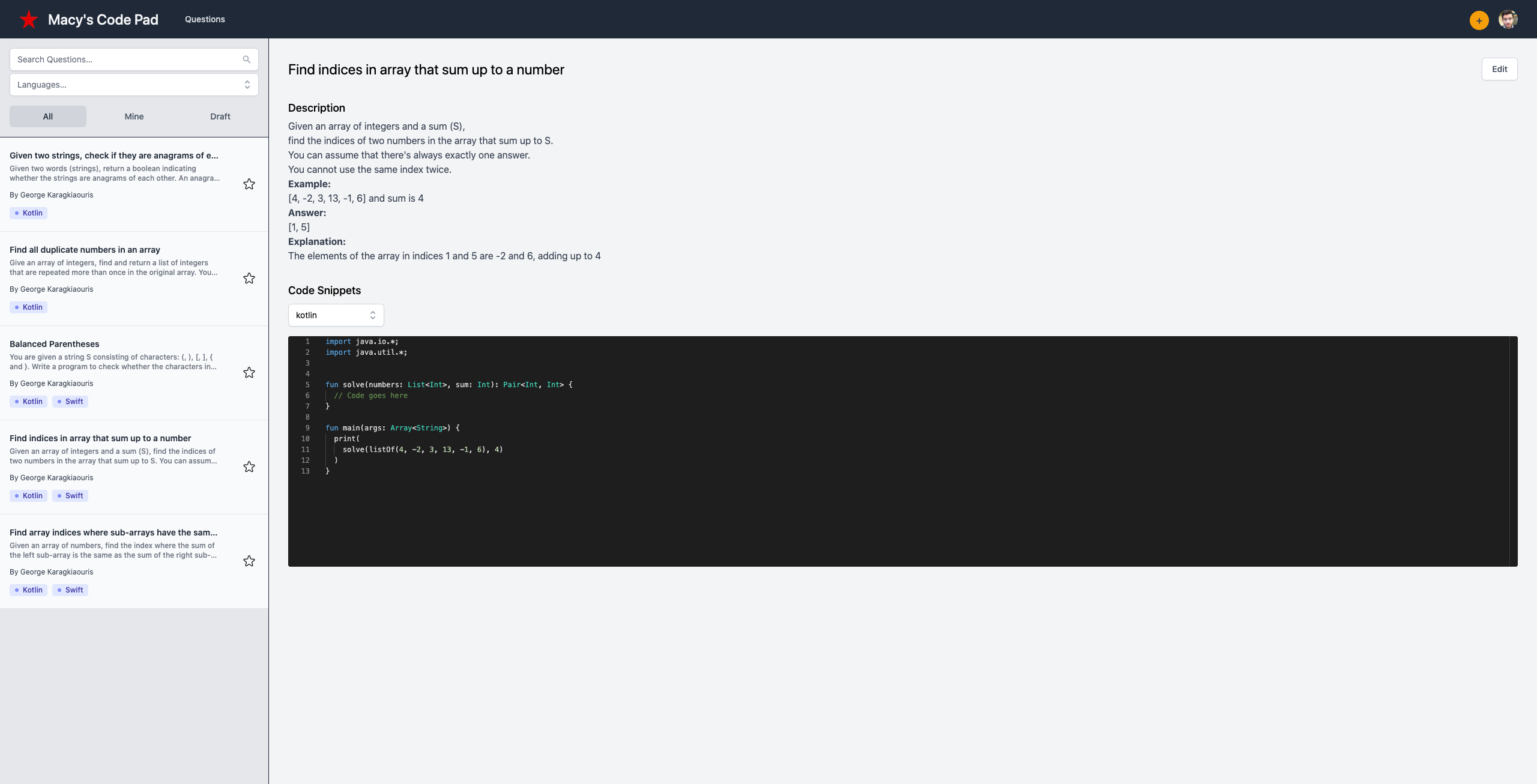 - Questions can have starter code samples in multiple languages (main focus is Kotlin and Swift)