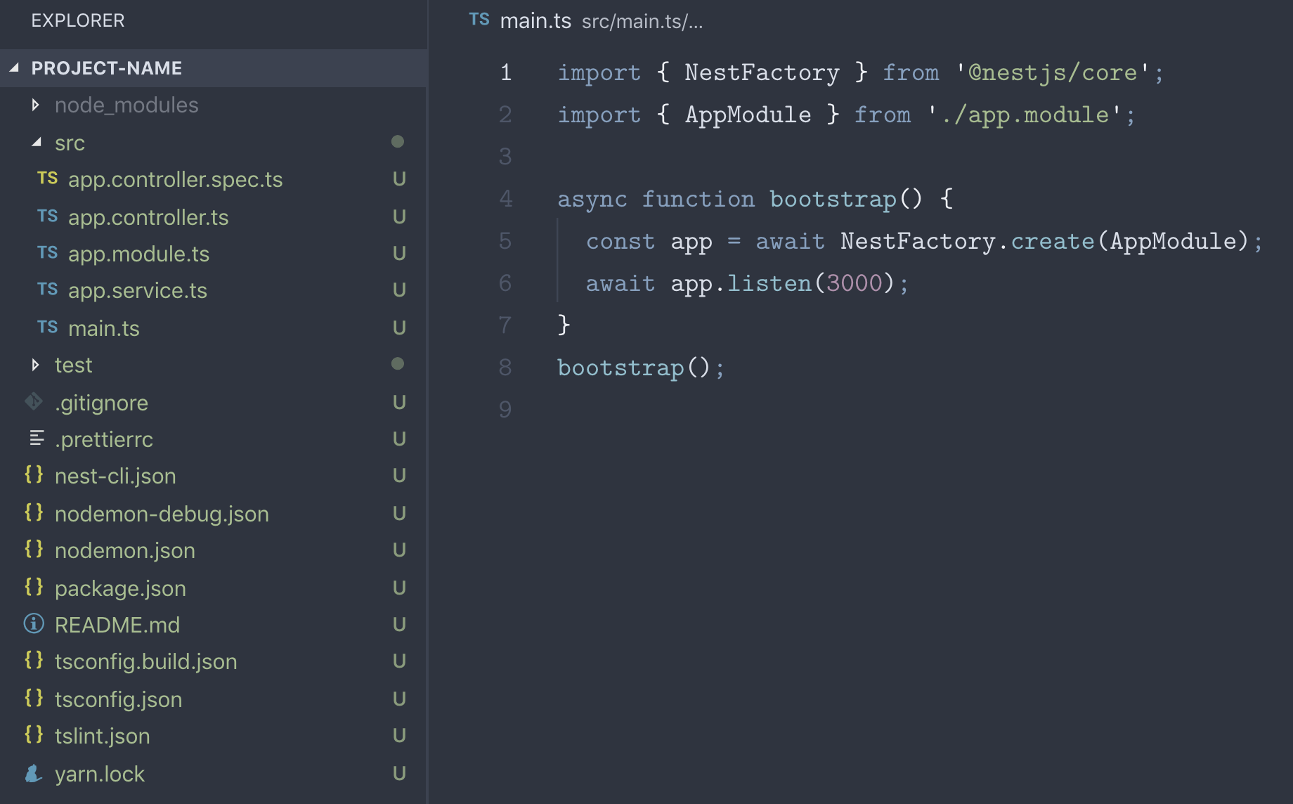 从上面的命令行中可以看出来整个项目是用 ts-node 跑起来的,这样的目的就是在开发环境节去了编译 .ts 的过程(实际上是 ts-node 在背后做了这个事情)。我们只需要关注 src/main.ts 这个入口文件即可。