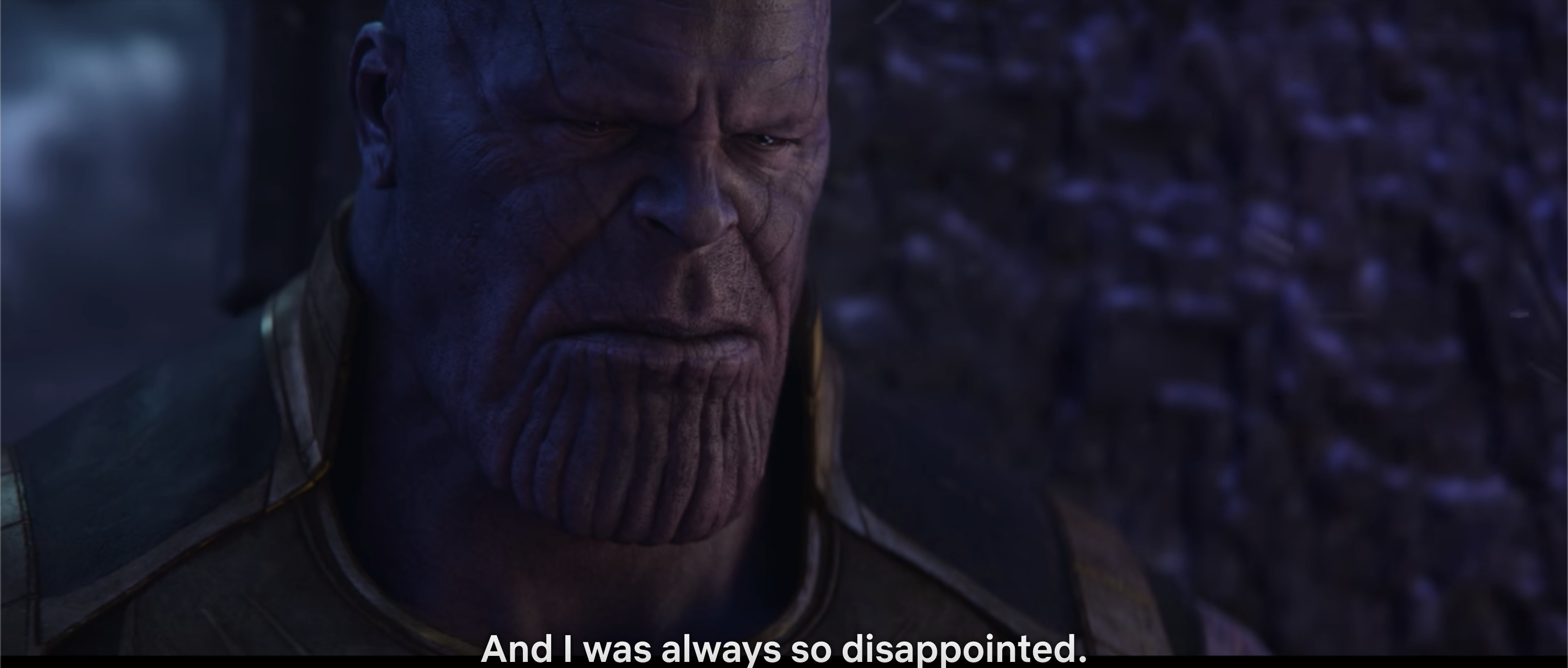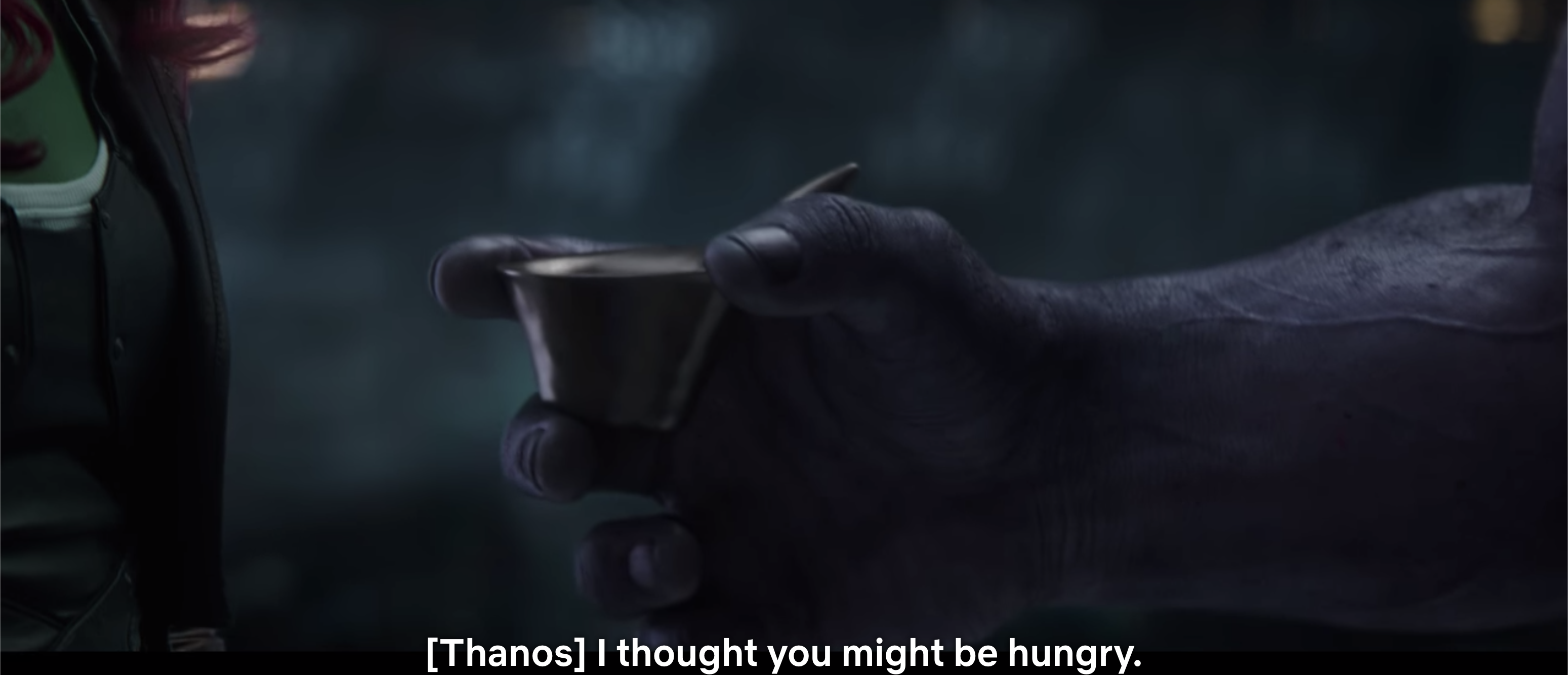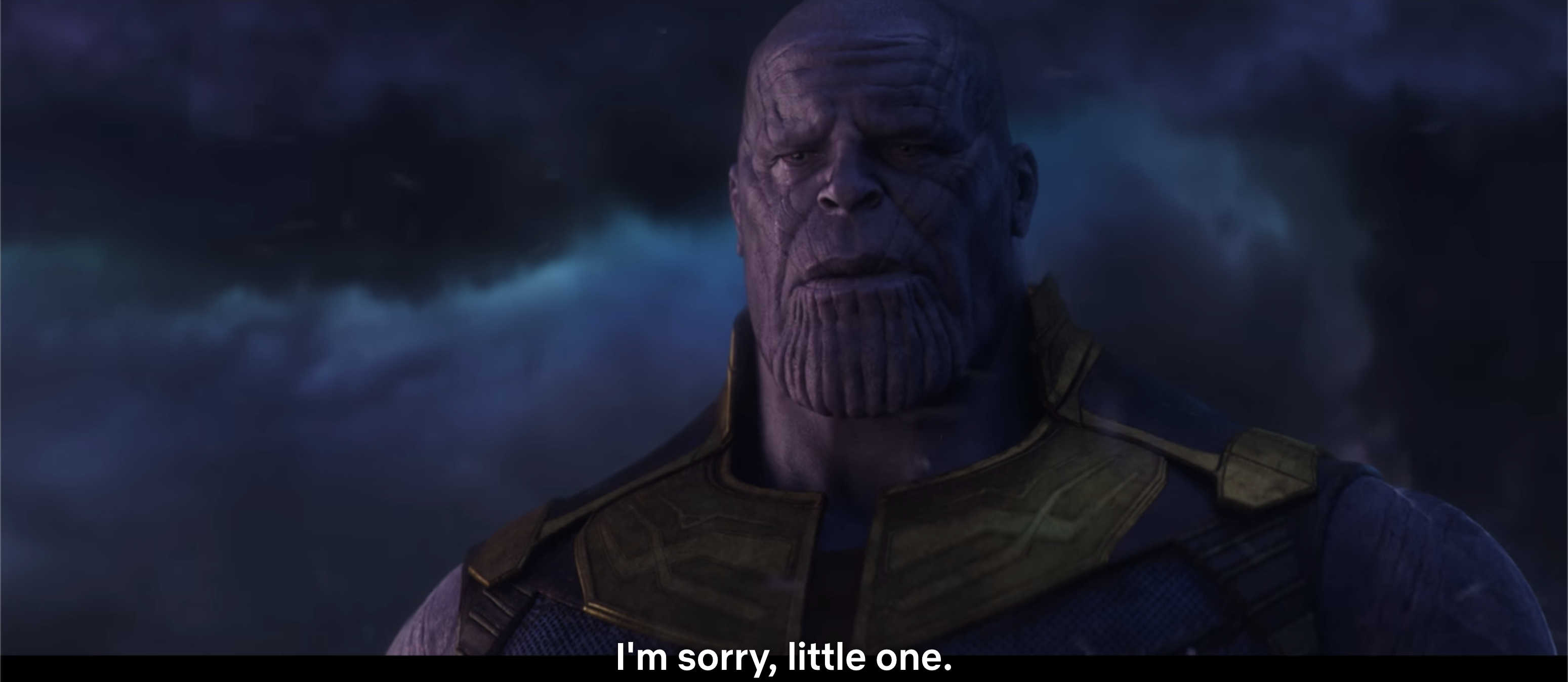 ++Thanos++(灭霸)很难想像灭霸在这一小段时间内,内心情绪有多么的复杂。他终其一生想要完成的事业却要让他失去至爱。他是一个无比理想化的存在,为了自己的理想可以放弃任何东西,而且他已经错过一次命运,所以这次他选择了完成自己的宿命。