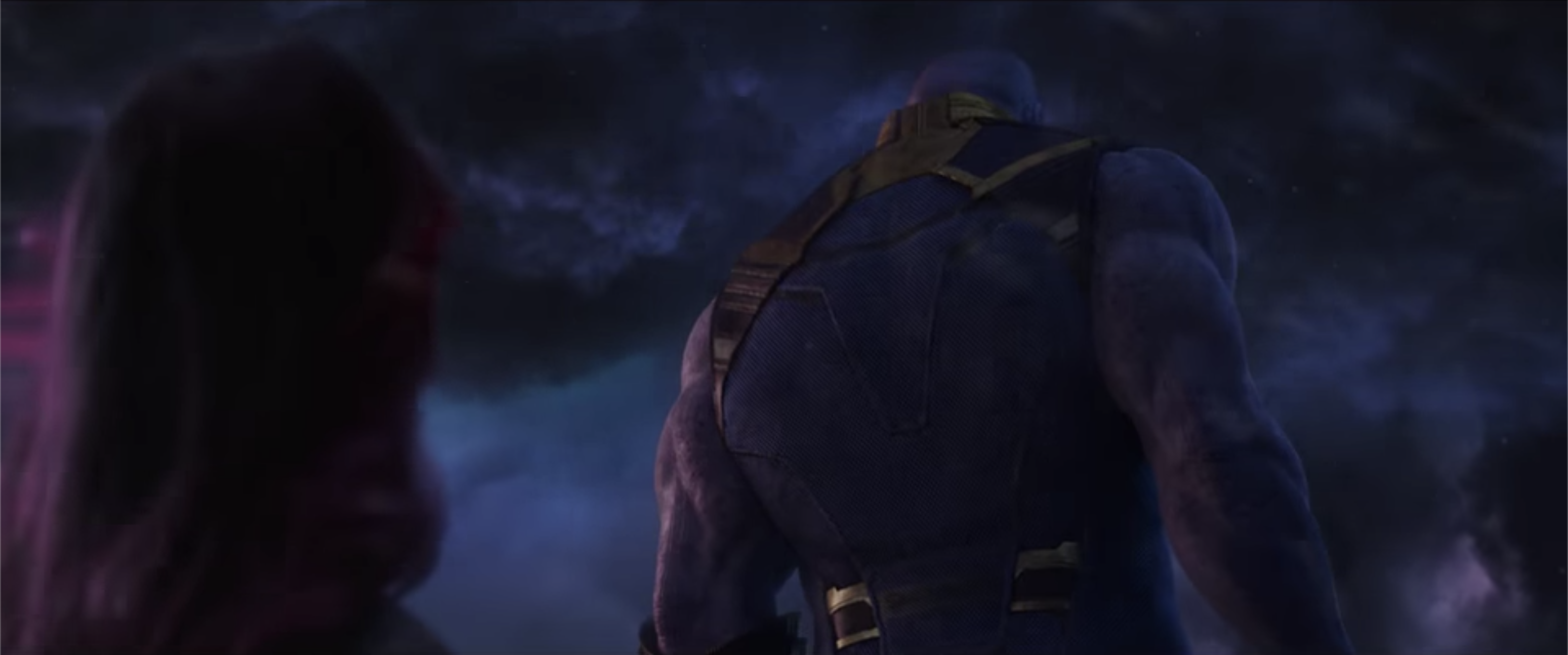 此时剧情已到了关键的转折点,灭霸的背影则暗喻着一位父亲的高大形象