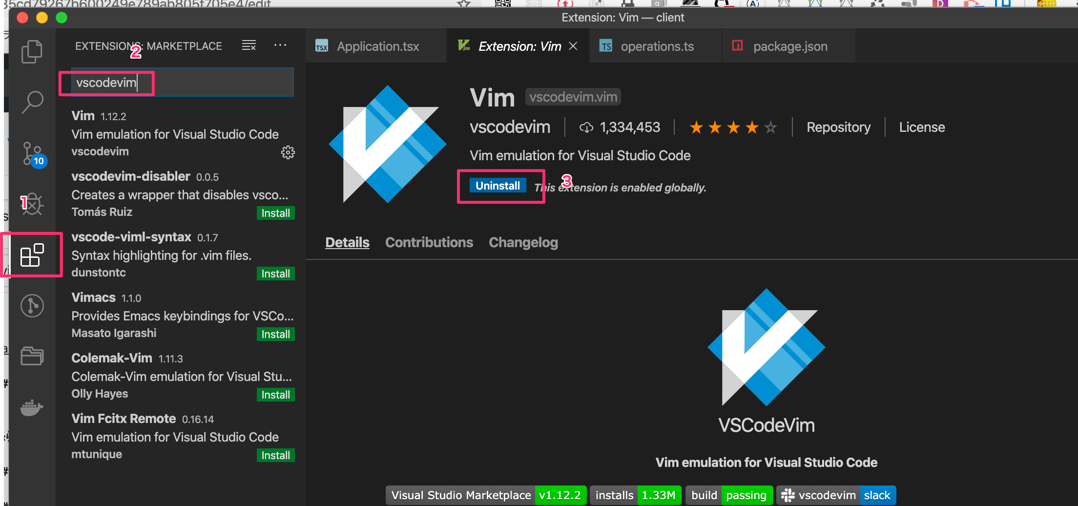 Once you uninstall vscodevim and search again from the extension, press the right gear mark to select the previous version.