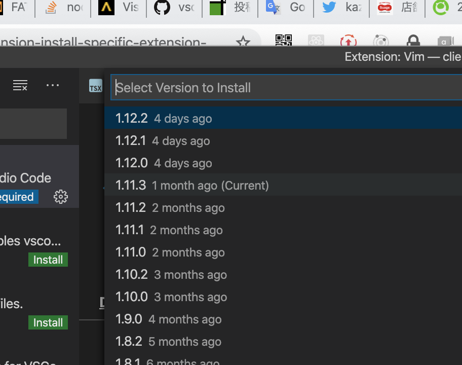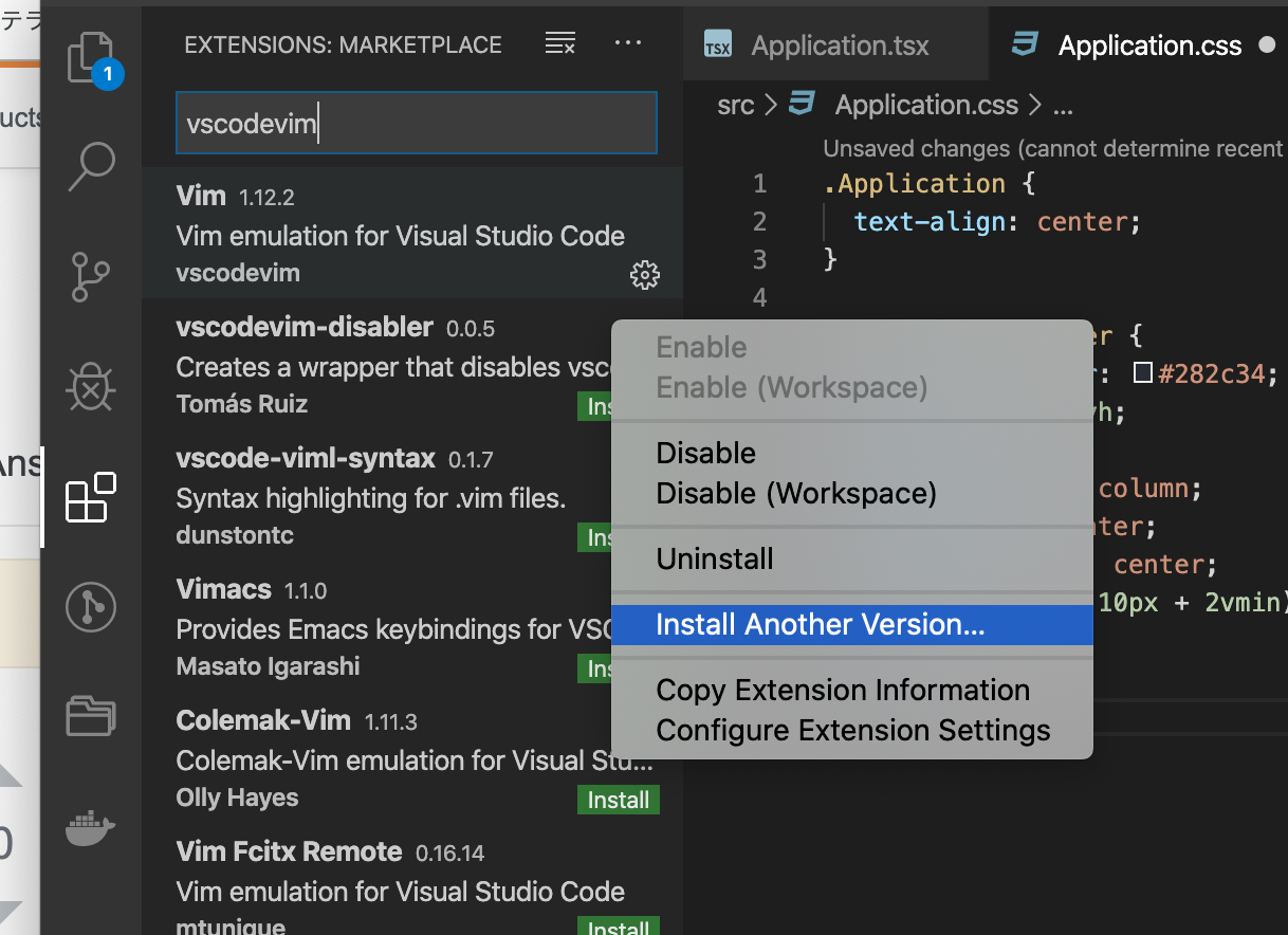 一度vscodevimをuninstallして拡張機能から再度検索、右歯車マークを押すと以前のバージョンを選択できる。