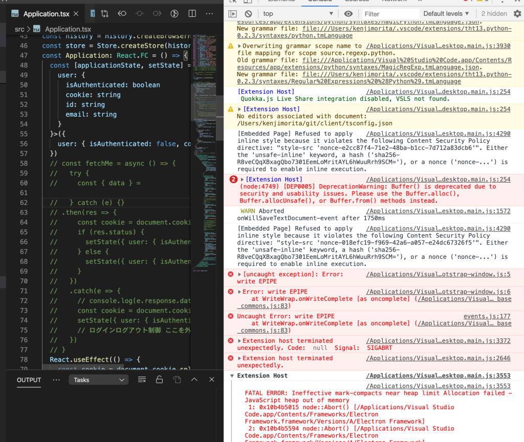 /Applications/Visual Studio Code.app/Contents/Resources/app/out/vs/workbench/workbench.desktop.main.js:3553 FATAL ERROR: Ineffective mark-compacts near heap limit Allocation failed - JavaScript heap out of memory 1: 0x10b4b5015 node::Abort() [/Applications/Visual Studio Code.app/Contents/Frameworks/Electron Framework.framework/Versions/A/Electron Framework] 2: 0x10b4b5594 node::Abort() [/Applications/Visual Studio Code.app/Contents/Frameworks/Electron Framework.framework/Versions/A/Electron Framework] 3: 0x1066806e7 v8::internal::FatalProcessOutOfMemory(v8::internal::Isolate*, char const*) [/Applications/Visual Studio Code.app/Contents/Frameworks/Electron Framework.framework/Versions/A/Electron Framework] 4: 0x106680687 v8::internal::FatalProcessOutOfMemory(v8::internal::Isolate*, char const*) [/Applications/Visual Studio Code.app/Contents/Frameworks/Electron Framework.framework/Versions/A/Electron Framework] 5: 0x1066c3d25 v8::internal::Heap::StartIdleIncrementalMarking(v8::internal::GarbageCollectionReason, v8::GCCallbackFlags) [/Applications/Visual Studio Code.app/Contents/Frameworks/Electron Framework.framework/Versions/A/Electron Framework] 6: 0x1066c5479 v8::internal::Heap::StartIdleIncrementalMarking(v8::internal::GarbageCollectionReason, v8::GCCallbackFlags) [/Applications/Visual Studio Code.app/Contents/Frameworks/Electron Framework.framework/Versions/A/Electron Framework] 7: 0x1066c1e0d v8::internal::Heap::CreateFillerObjectAt(unsigned long, int, v8::internal::ClearRecordedSlots, v8::internal::ClearFreedMemoryMode) [/Applications/Visual Studio Code.app/Contents/Frameworks/Electron Framework.framework/Versions/A/Electron Framework] 8: 0x1066bf8db v8::internal::Heap::CollectGarbage(v8::internal::AllocationSpace, v8::internal::GarbageCollectionReason, v8::GCCallbackFlags) [/Applications/Visual Studio Code.app/Contents/Frameworks/Electron Framework.framework/Versions/A/Electron Framework] 9: 0x1066cb694 v8::internal::Heap::PromotedExternalMemorySize() [/Applications/Visual Studio Code.app/Contents/Frameworks/Electron Framework.framework/Versions/A/Electron Framework]10: 0x1066cbc3f v8::internal::Heap::PromotedExternalMemorySize() [/Applications/Visual Studio Code.app/Contents/Frameworks/Electron Framework.framework/Versions/A/Electron Framework]11: 0x1068c99e6 v8::internal::Factory::NewFillerObject(int, bool, v8::internal::AllocationType) [/Applications/Visual Studio Code.app/Contents/Frameworks/Electron Framework.framework/Versions/A/Electron Framework]12: 0x106b2bdcb v8::internal::RegExpParser::ParseRegExp(v8::internal::Isolate*, v8::internal::Zone*, v8::internal::FlatStringReader*, v8::base::Flags<v8::internal::JSRegExp::Flag, int>, v8::internal::RegExpCompileData*) [/Applications/Visual Studio Code.app/Contents/Frameworks/Electron Framework.framework/Versions/A/Electron Framework]13: 0x10712fd99 v8::internal::compiler::ZoneStats::ReturnZone(v8::internal::Zone*) [/Applications/Visual Studio Code.app/Contents/Frameworks/Electron Framework.framework/Versions/A/Electron Framework]<--- Last few GCs --->[4749:0x10cfd1000] 245489 ms: Mark-sweep 1882.4 (2078.1) -> 1872.5 (2079.3) MB, 1352.5 / 0.0 ms (average mu = 0.095, current mu = 0.018) allocation failure scavenge might not succeed[4749:0x10cfd1000] 247459 ms: Mark-sweep 1885.9 (2079.8) -> 1875.9 (2079.8) MB, 1945.2 / 0.0 ms (average mu = 0.047, current mu = 0.012) allocation failure scavenge might not succeed<--- JS stacktrace --->==== JS stack trace ========================================= 0: ExitFrame [pc: 0x10712fd99]Security context: 0x352ef81a5d01 <JSObject> 1: /* anonymous */ [0x352e8ce57869] [/Users/kenjimorita/.vscode/extensions/vscodevim.vim-1.12.2/out/src/mode/modeHandler.js:~1116] [pc=0x351f4f4243b8](this=0x352e3d6c8061 <ModeHandler map = 0x352e741daa39>) 2: next [0x352ef81a2239](this=0x352e8ce57be9 <JSGenerator>) 3: /* anonymous */ [0x352e8ce570e9] [/Users/kenjimorita/.vscode/extensions/vscodevim...この対応