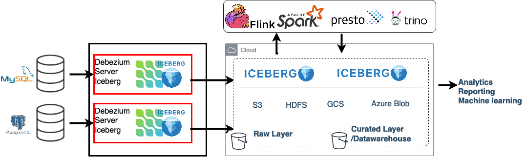運用データは通常、リレーショナルデータベースまたはNoSQLデータストアに保存されるため、データをどのようにデータレイクに伝播させるかが問題となります。 ここで登場するのがDebezium Server Icebergプロジェクトです。 DebeziumとApache Icebergをベースとするこのプロジェクトは、ソースデータベースからのリアルタイムのデータ変更イベントを処理し、 Icebergがサポートする任意のオブジェクトストレージにアップロードできます。 それでは、この2つのプロジェクトについて詳しく見ていきましょう。