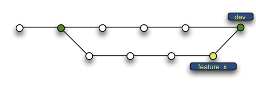 As Git monitors the changes we have made over time to our software, we can model it in our heads as a timeline, like such above, with each dot across the timeline being a commit to the code.