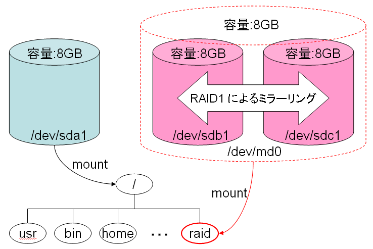 /dev/sdb /dev/sdb1 /dev/sdc /dev/sdc1/dev/sd{b,c} で RAID1 を構築し、仮想デバイス(?) /dev/md0 を作成する。