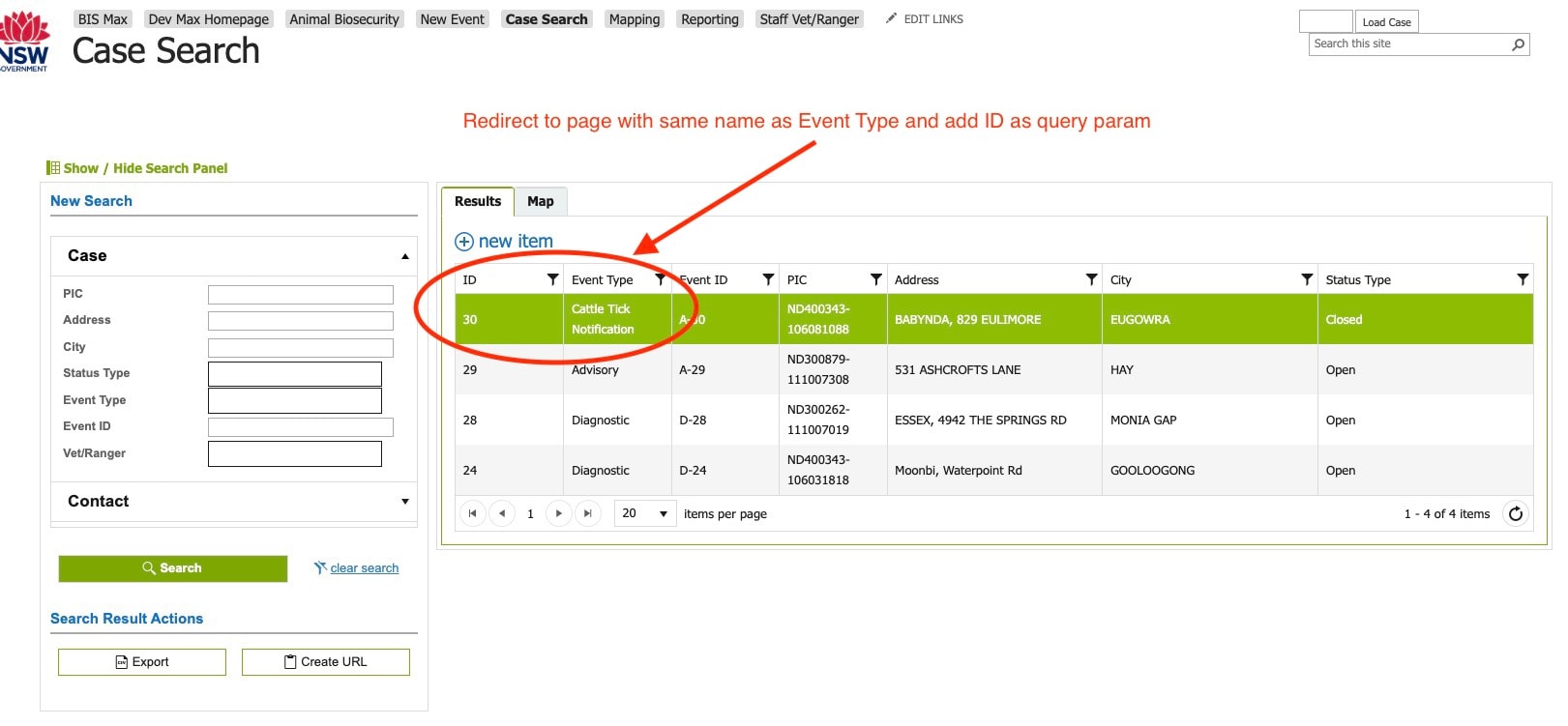 In this case we are grabbing the event type (max form name) and id from the table row, creating a clickable event to redirect. The caveat being that the table is loaded asynchronously and is subject to change.