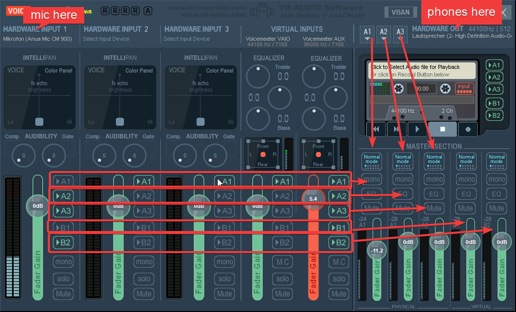 in voicmeeter you first need to select you input device where "mic here" is pointing and the output
