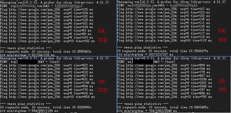测试工具为 vmessping,可见 Vmess + TCP + TLS(左)延迟低于 Vmess + WSS(右)