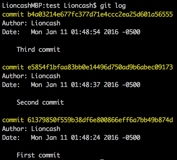 Say you make three commits, each one labeled "First commit", "Second commit", and "Third commit" respectively. Now, you want to squash the third commit into the second commit. You'll want to get the hash for the commit behind the commit we want to squash things into, so the commit that we're squashing things into shows up in the staging area.